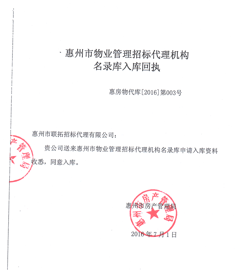 招標代理機構(gòu)房產(chǎn)入庫回執(zhí)